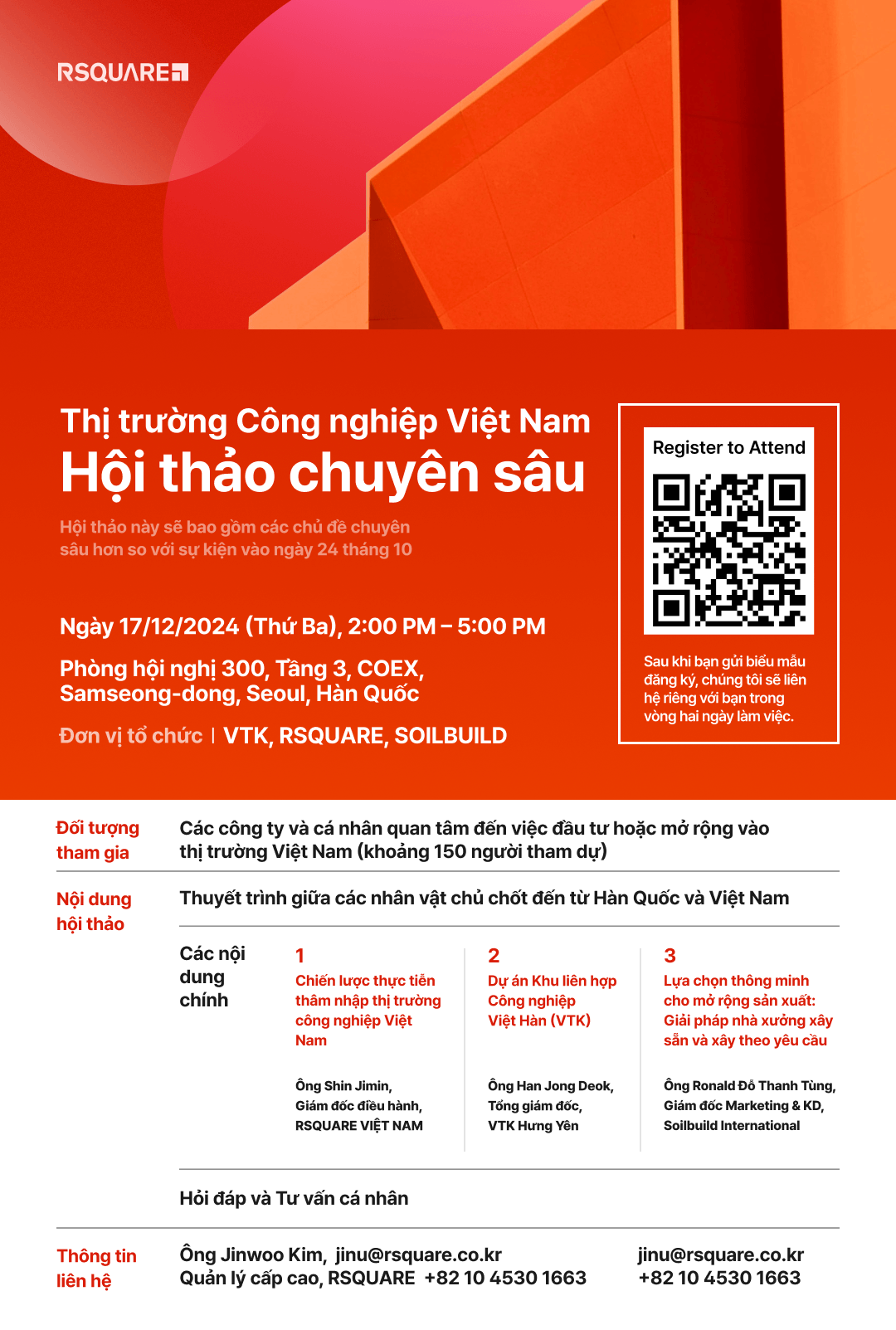 Hội thảo tập trung vào thị trường công nghiệp Việt Nam sẽ được tổ chức tại COEX Samseong-dong, Seoul vào Thứ Ba, ngày 17 tháng 12, đồng tổ chức bởi Khu Công Nghiệp Hợp Tác Kinh Tế Việt-Hàn (VTK), RSQUARE và SOILBUILD Group.